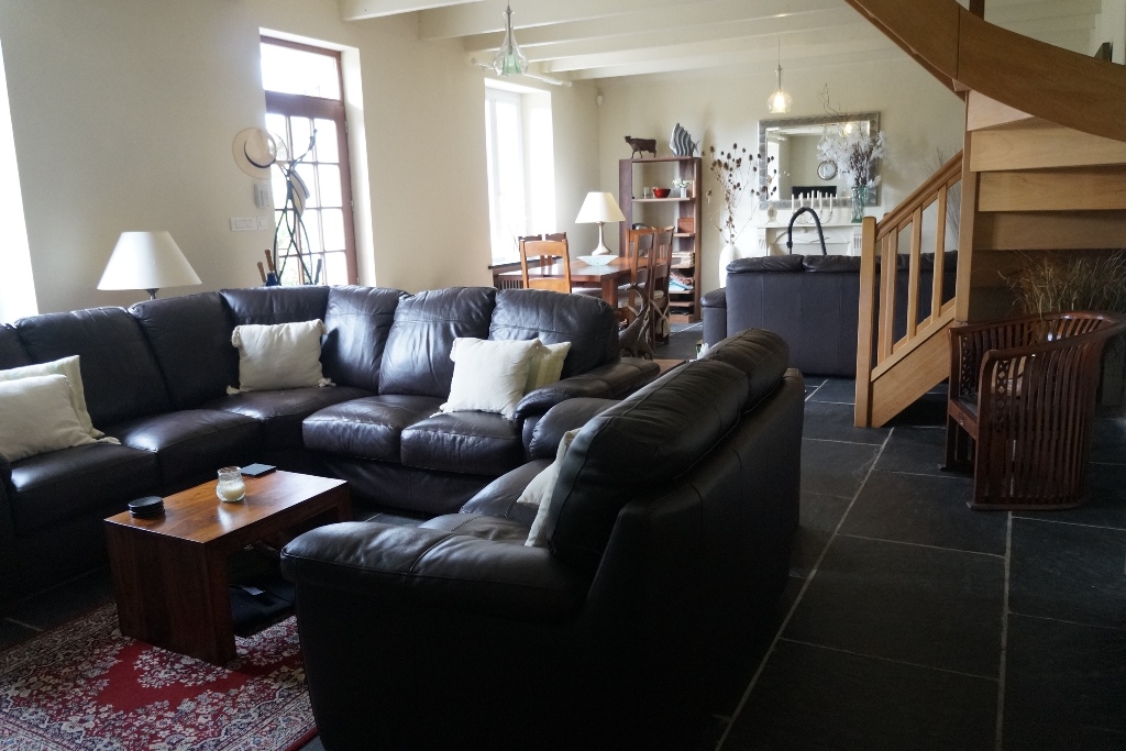 Ground floor: Doorway into the open plan and spacious lounge dining room with a slate floor, a hallway with a modern shower room, WC and wash hand basin.