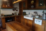 A pretty solid wood kitchen, open plan to the lounge, is to the right of the lounge, with a white Belfast sink, gas hob and electric oven.